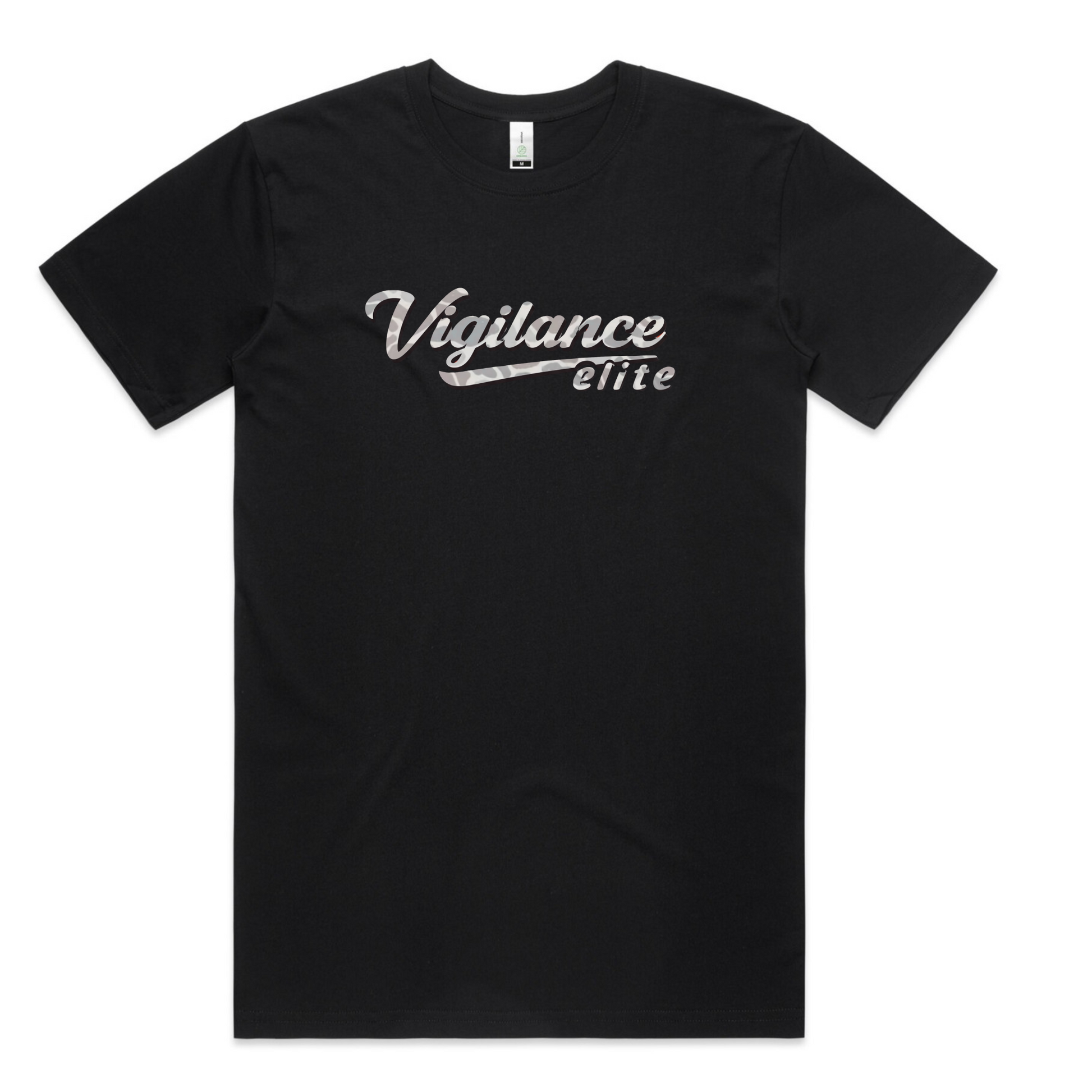 The Nocturne Camo Tee is a sleek black t-shirt featuring a striking camo-colored "Vigilance Elite" script logo, blending bold style with tactical flair. Crafted from premium, 100% combed organic, comfortable cotton, it’s perfect for everyday wear or standing out in the field. Embrace the night with this versatile, durable tee.